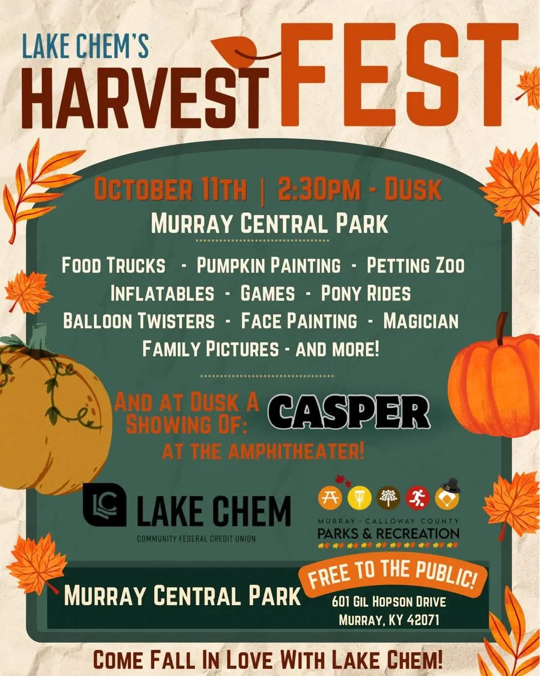DON’T MISS LAKE CHEM’S HARVEST FEST! Saturday, October 11th from 2:30-dusk at Central Park in Murray. This FREE EVENT  includes Food Trucks, Pumpkin Painting, Petting Zoo, Inflatables, Games, Pony Rides, Balloon Twisters, Face Painting, Magician, Family Pictures – AND MORE! PLUS, a showing of the movie Casper at the amphitheater at dusk.